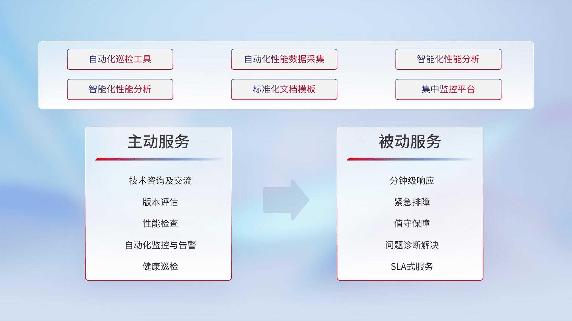智能化工具和标准化文档,,,,保障服务质量,,,,提供主动服务(包含技术咨询、、版本评估、、、、性能检查、、、、自动化监控与告警、、、、健康巡检)和被动服务包含(分钟级响应、、紧急排障、、、、值守保障、、问题诊断解决、、、、SLA服务)。。