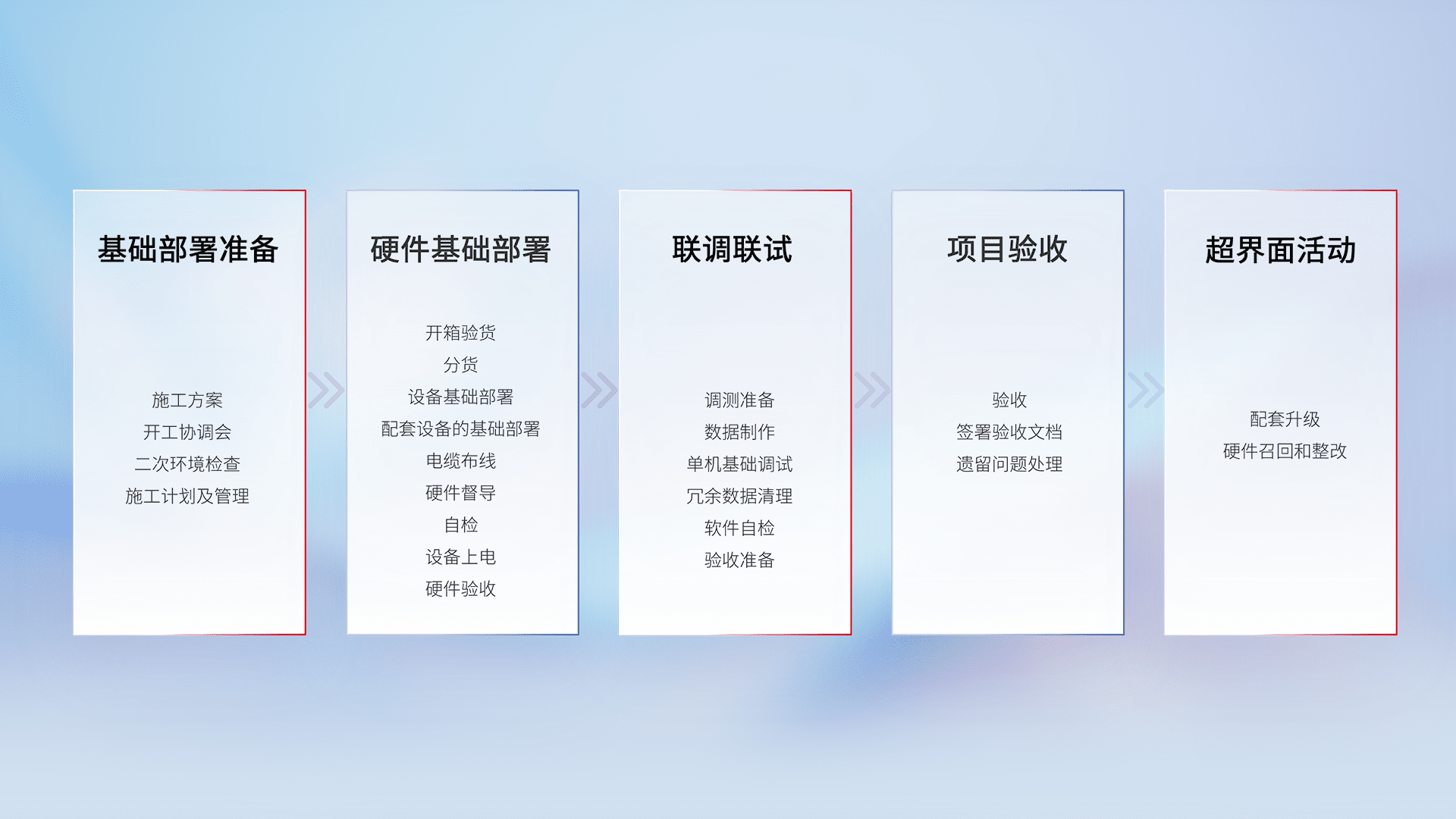 从基础部署准备、、硬件基础部署、、、、联调联试、、、项目验收、、、、越界面活动的全过程可追溯,,,保证施工质量和进度。。