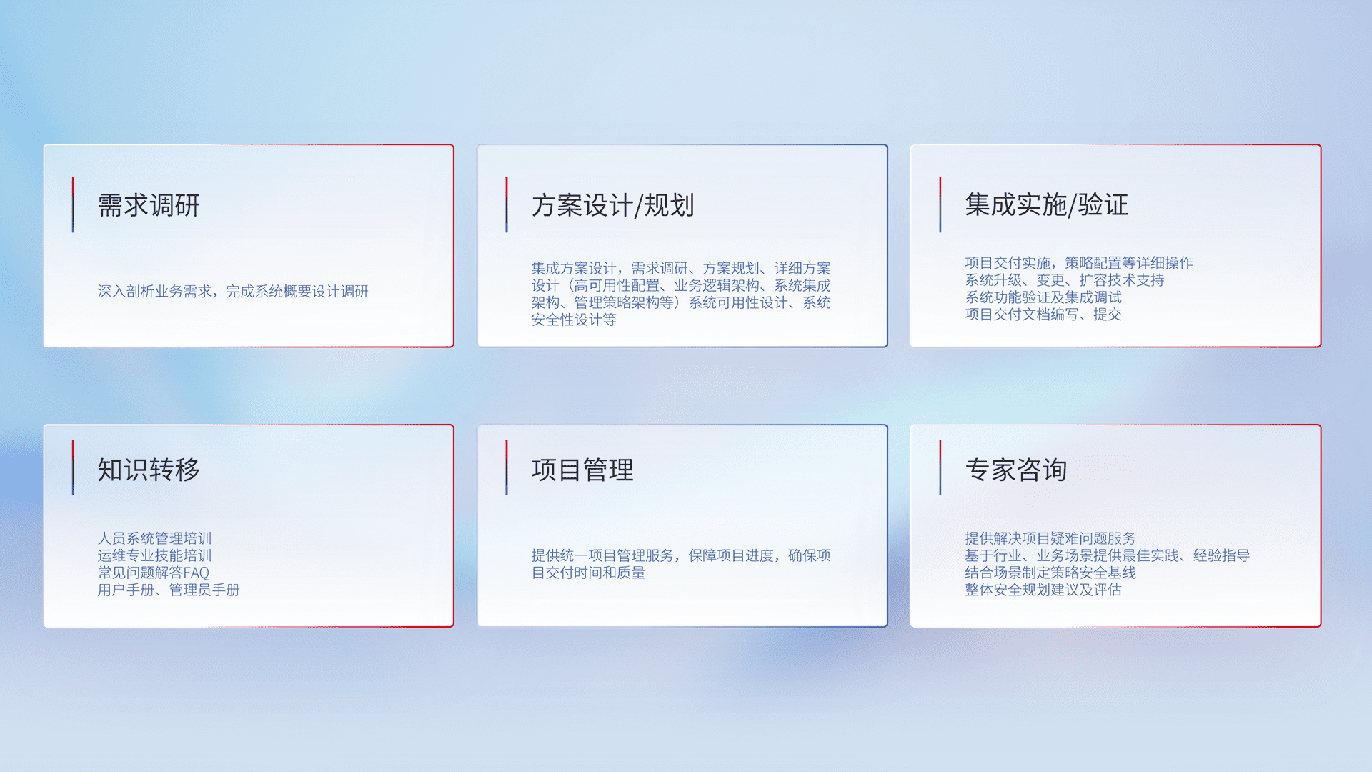 针对客户行业特性,,,将宏观的安全战略和需求,,通过专业的交付服务,,实现项目落地,,为客户提供标准规范的集成交付服务。。